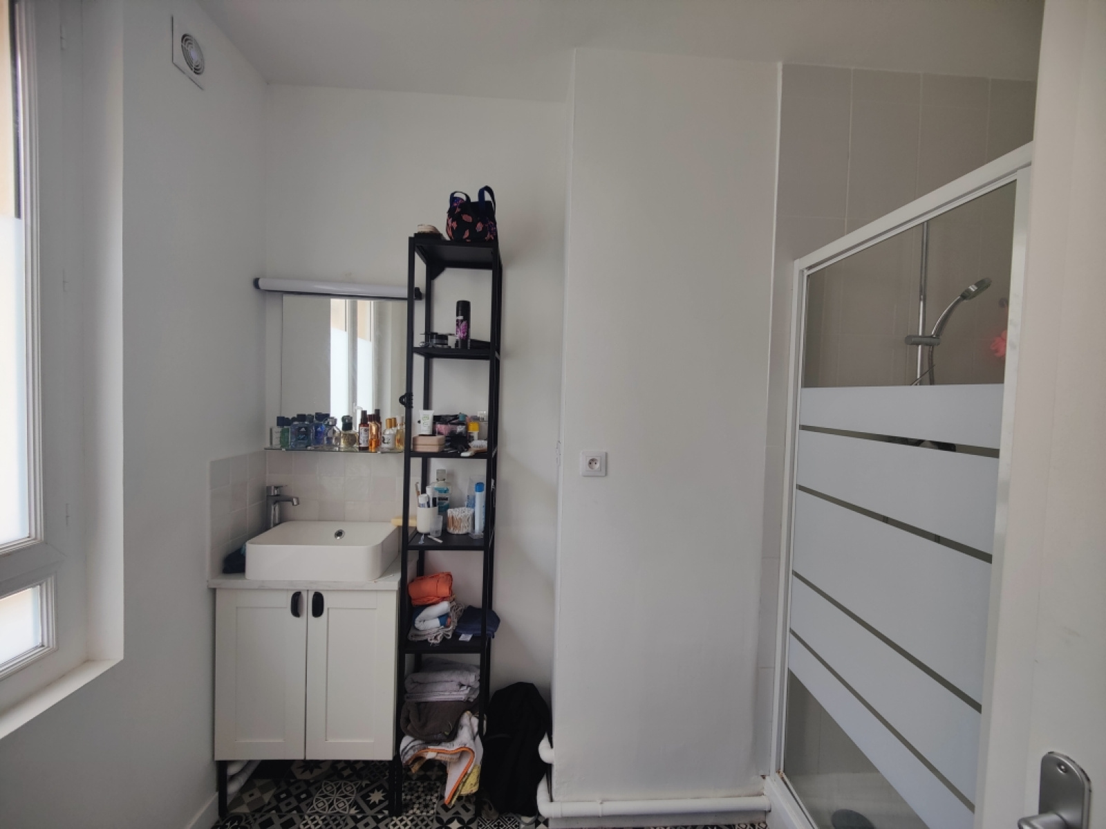 Une salle de bain avec douche et sèche serviette